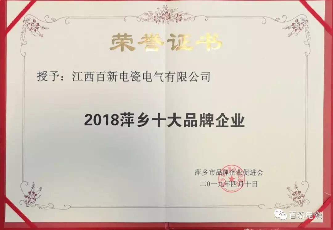 在此次评选中江西best365官网下载电瓷电气有限公司荣获了“2018萍乡十大品牌企业”称号 。